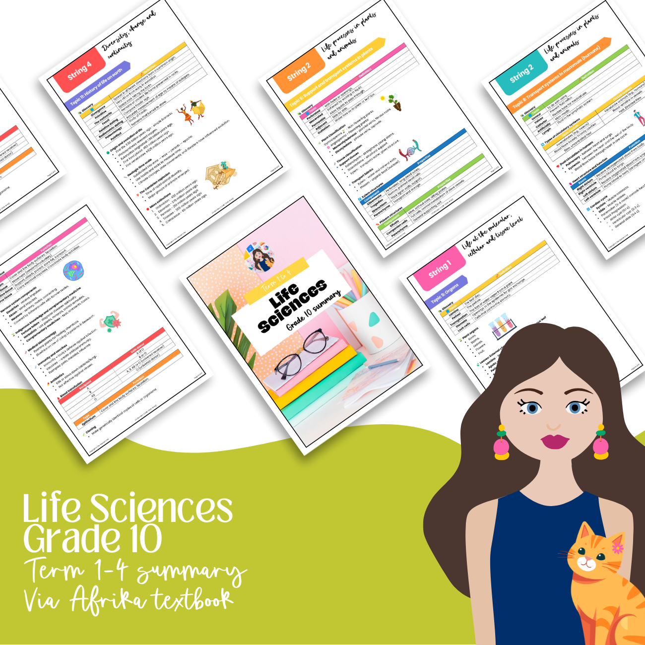 This document is a complete summary of all quarterly content for Life Sciences Grade 10, based on the Via Afrika textbook. It covers key topics such as the chemistry of life, cells, cell division, tissue studies, organs, support systems, transport systems, the biosphere, biodiversity, and the history of evolution. The summary includes definitions, explanations, comparisons, tables, and case studies – ideal for revision and exam preparation.