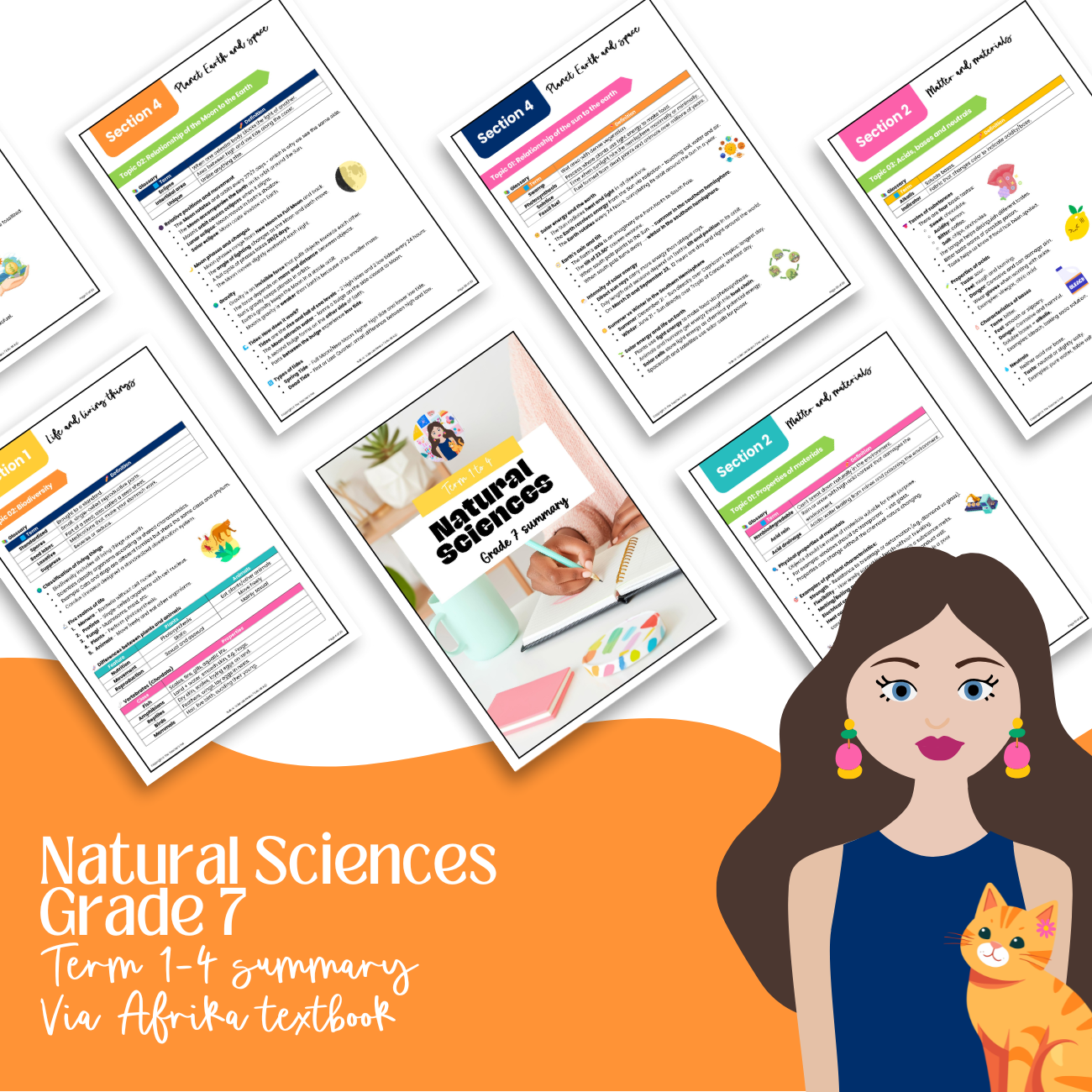 This document provides a complete, quarter-by-quarter summary of the Via Afrika Natural Sciences textbook for Grade 7. It covers all four terms and includes key topics such as the biosphere, biodiversity, reproduction, materials and mixtures, energy and electricity, as well as the relationship between the Earth, Sun, and Moon. The content is systematically organized and ideal for revision and exam preparation.