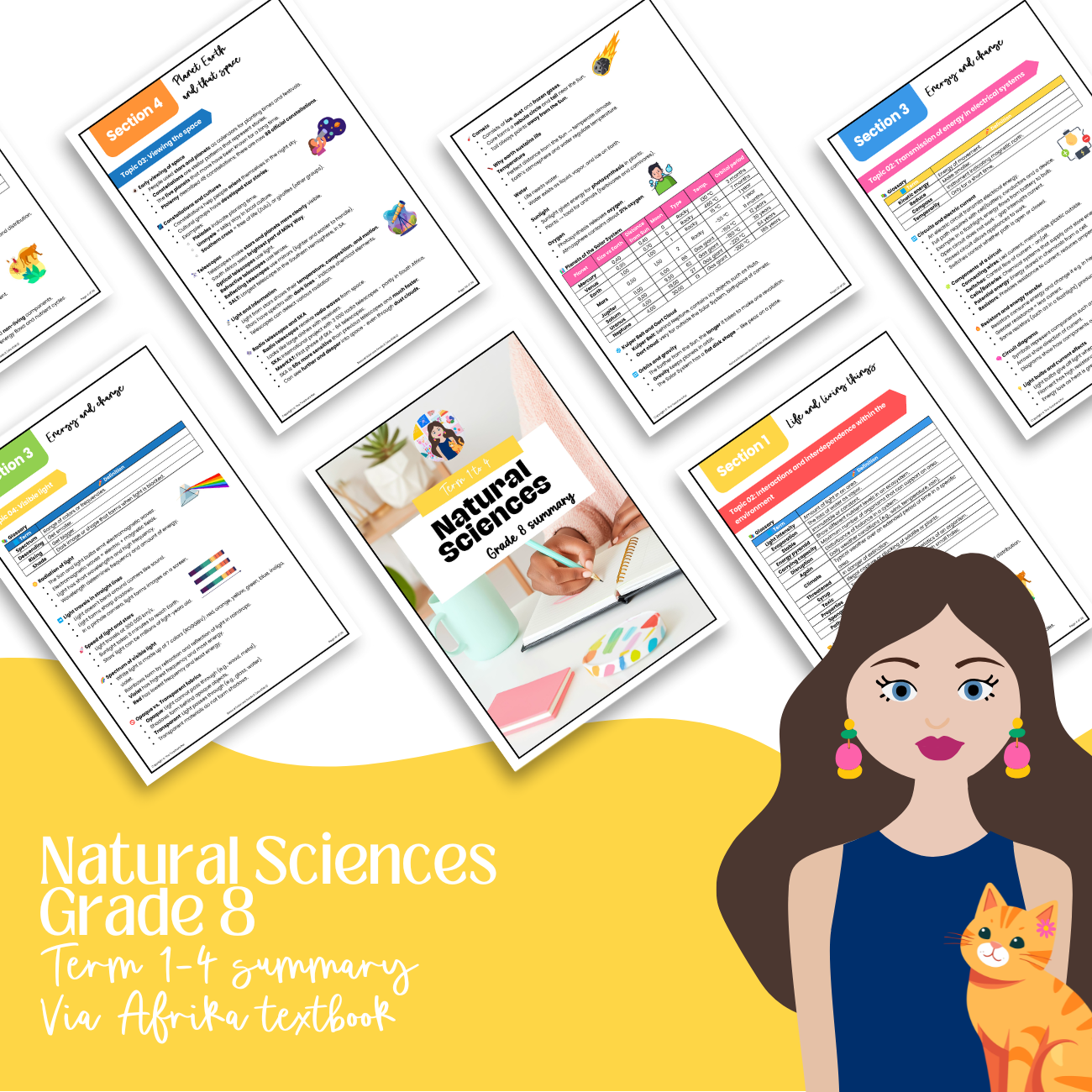 This document is a comprehensive summary of all the core topics for Grade 8 Natural Sciences, based on the Via Afrika textbook. It covers terms 1 to 4 and includes themes such as photosynthesis, micro-organisms, chemical reactions, electricity, visible light, and space. Each unit contains key terms, explanations, processes, and examples, making it ideal for exam revision and test preparation.