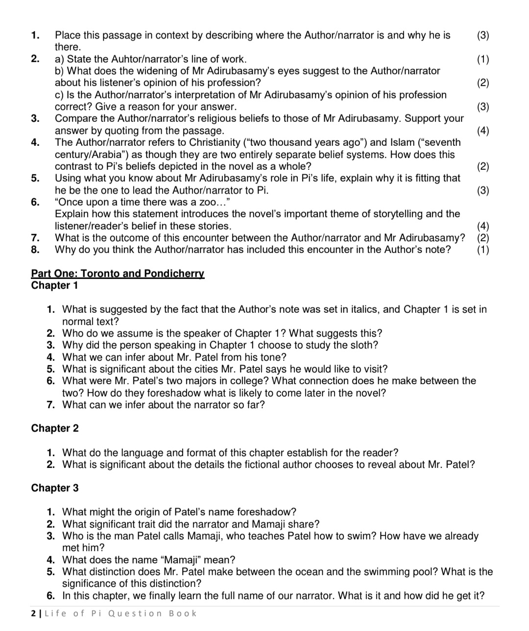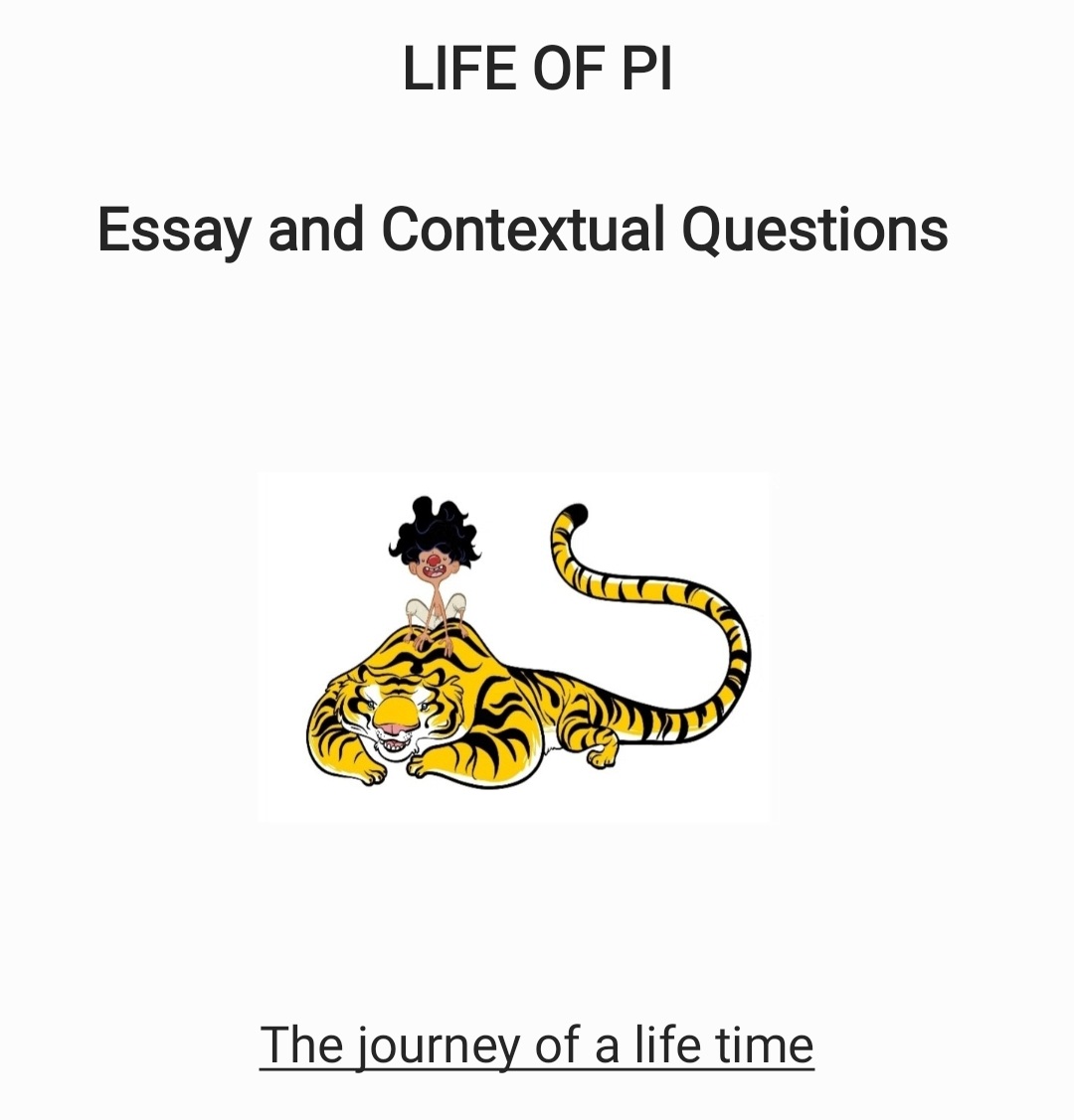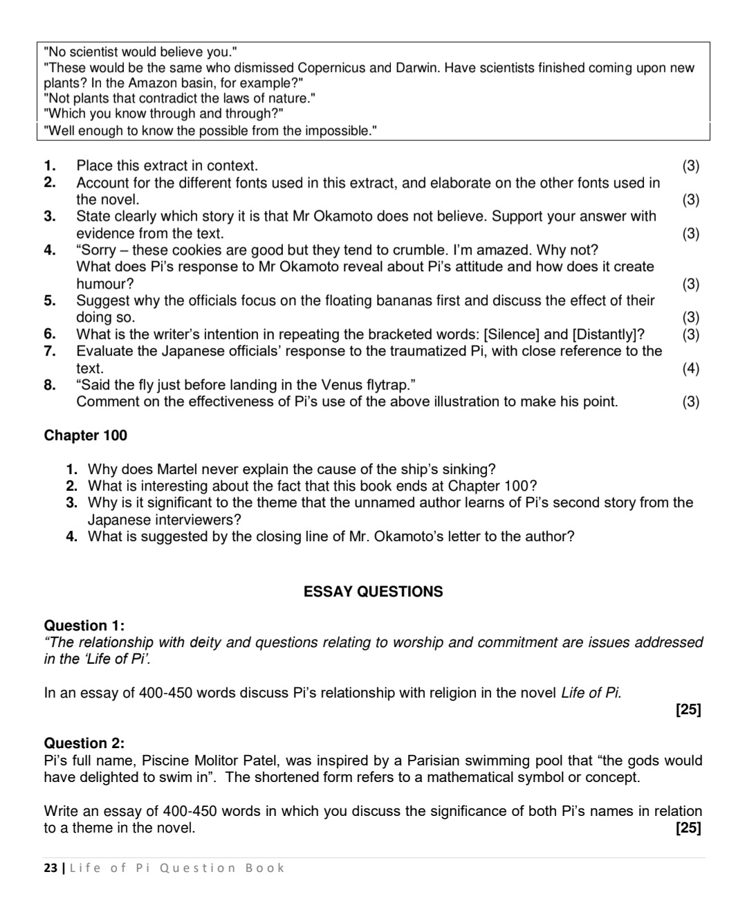 These are Life of Pi Essay and Contextual questions with answers . They are there to help prepare your learner or child for their exams . It consists of questions with answers covering all the aspects with questions on each of the 100 chapters and essay questions as well. There are 12 Essays Questions with 5 already answered for you