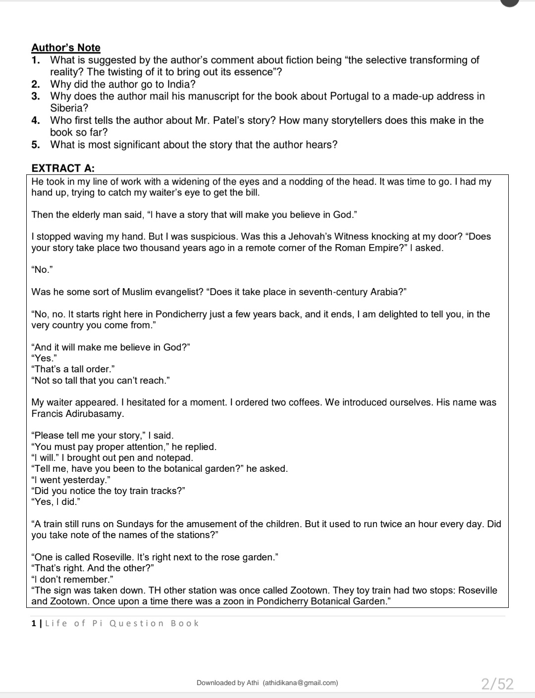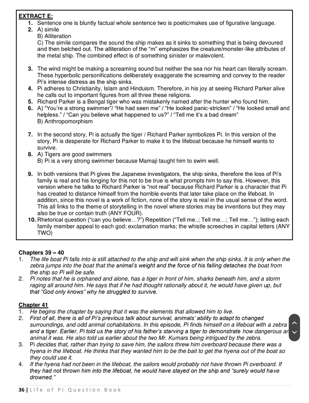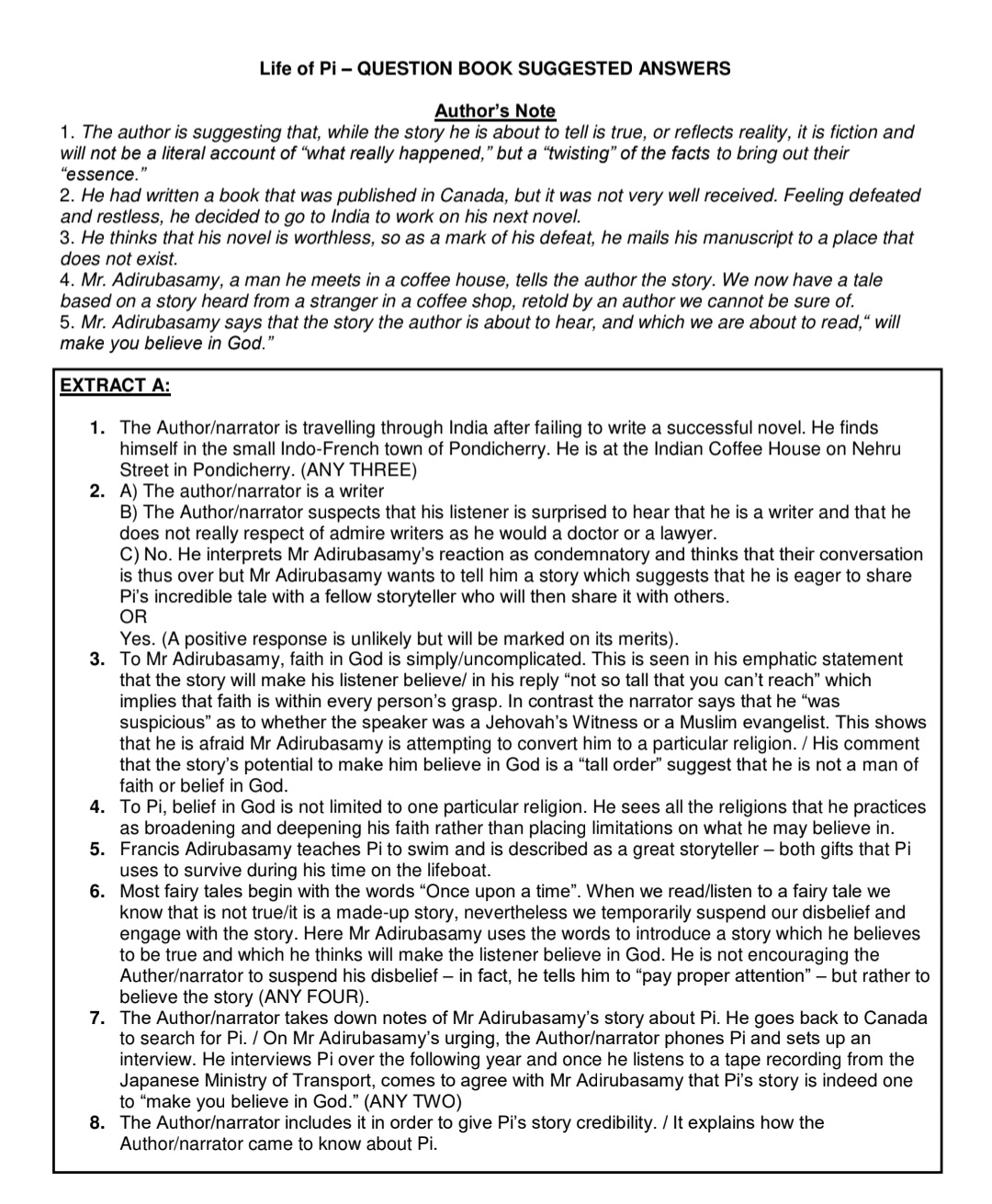 These are Life of Pi Essay and Contextual questions with answers . They are there to help prepare your learner or child for their exams . It consists of questions with answers covering all the aspects with questions on each of the 100 chapters and essay questions as well. There are 12 Essays Questions with 5 already answered for you