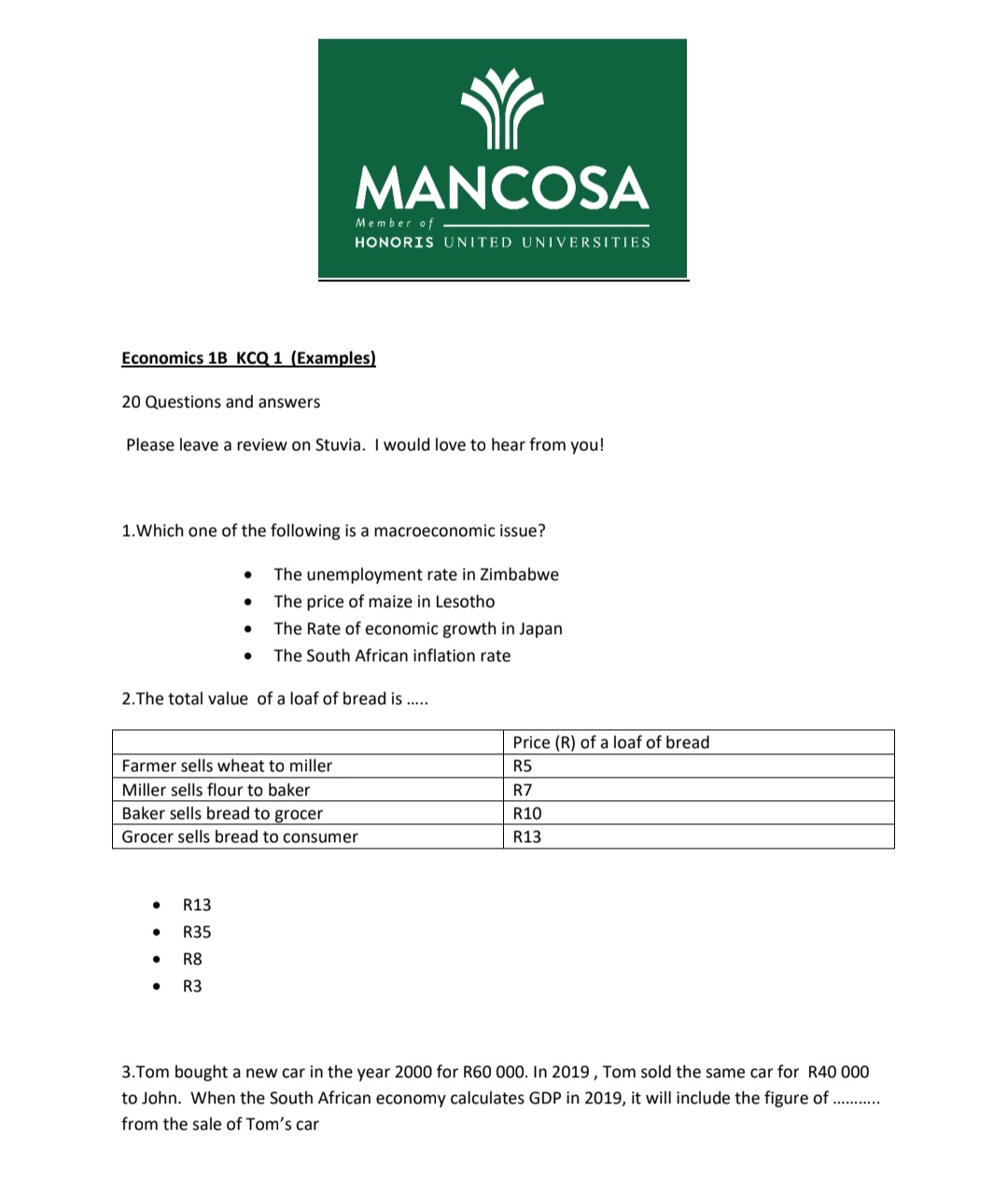 These are 20 multiple choice questions and answers on economics 1B KCQ1 covering various aspects of economics 1B which will assist you in your formative assessment 1 . Please leave us a review.
