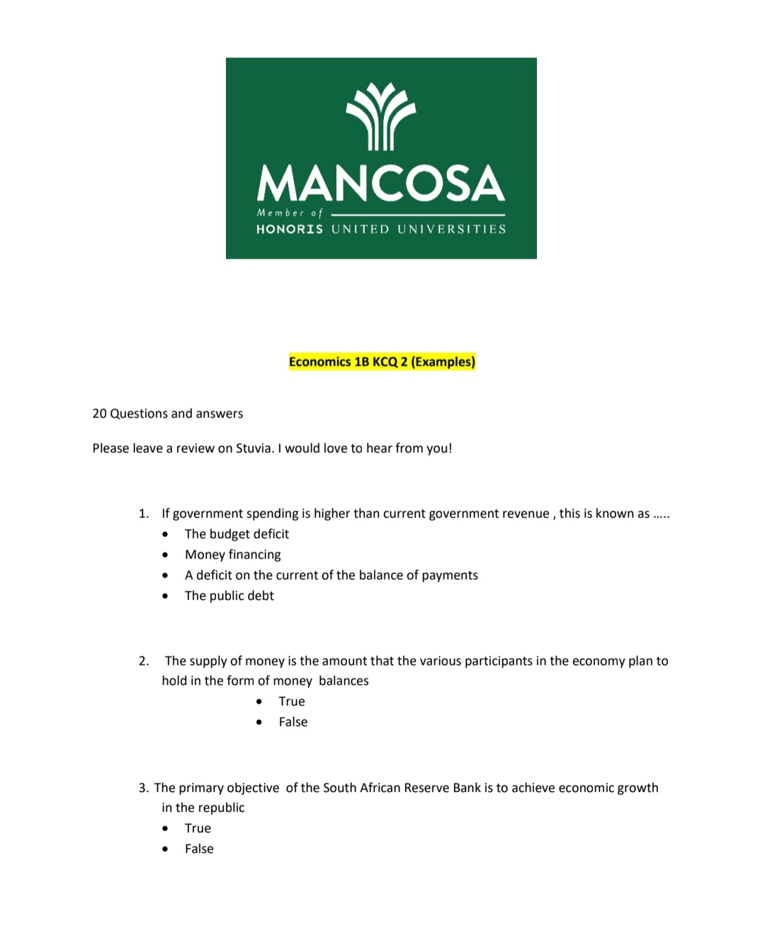 These are 20 multiple choice questions and answers on economics 1B KCQ2 covering various aspects of economics 1B which will assist you in your formative assessment 1 . Please leave us a review.