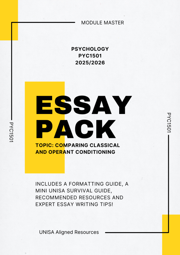 The pack is designed to give you a real advantage! Whether you’re prepping for exams, stuck on your first psychology assignment or just want to see what a high-mark essay looks like – this resource saves you time, reduces stress and helps you meet UNISA’s academic standards with confidence.